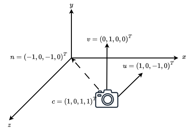 \[(\mathbf{M}^{T})^{-1}=\begin{bmatrix} u^T\\ v^T\\ n^T\\ 0&0&0&1 \end{bmatrix}=\begin{bmatrix} 1&0&-1&1\\ 0&1&0&0\\ -1&0&-1&1\\ 0&0&0&1 \end{bmatrix}^{-1}=\begin{bmatrix} \frac{1}{2}&0&-\frac{1}{2}&0\\ 0&1&0&0\\ -\frac{1}{2}&0&-\frac{1}{2}&1\\ 0&0&0&1 \end{bmatrix} \]