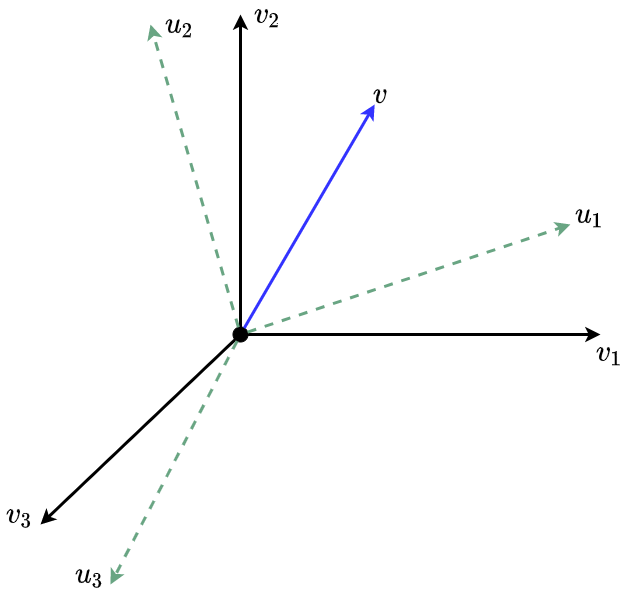 \[\begin{aligned} \vec{v}=\alpha_1\vec{v_1}+\alpha_2\vec{v_2}+\alpha_3\vec{v_3}=[\alpha_1\ \alpha_2\ \alpha_3][\vec{v_1}\ \vec{v_2}\ \vec{v_3}]^{T}\\ =\beta_1\vec{u_1}+\beta_2\vec{u_2}+\beta_3\vec{u_3}=[\beta_1\ \beta_2\ \beta_3][\vec{u_1}\ \vec{u_2}\ \vec{u_3}]^{T}\end{aligned}\]