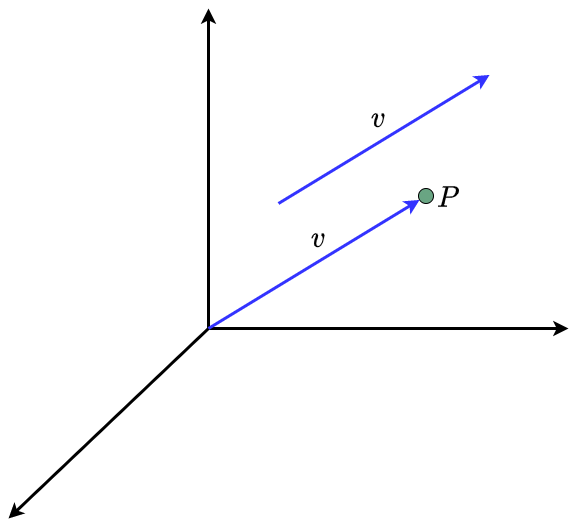 从前面的描述中,可以看到,点和向量的表示类似,有 \[\mathbf{P}=[\beta_1\ \beta_2\ \beta_3]\] \[\mathbf{\vec{v}}=[\alpha_1\ \alpha_2\ \alpha_3]\] 但是,点有位置,向量没有位置