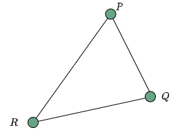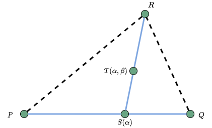 图中,$S(\alpha)$为$P$和$Q$的仿射和,$T(\alpha,\beta)$为$S(\alpha)$和$R$的仿射和,若$0\leq\alpha,\beta\leq 1$,则所有的点都定义在三角形$PQR$内部